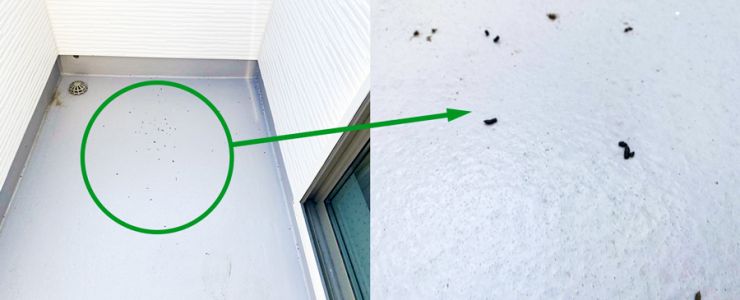 以下の写真のように、黒い粒が毎日のように落ちていることがありましたら、コウモリを疑ってください。